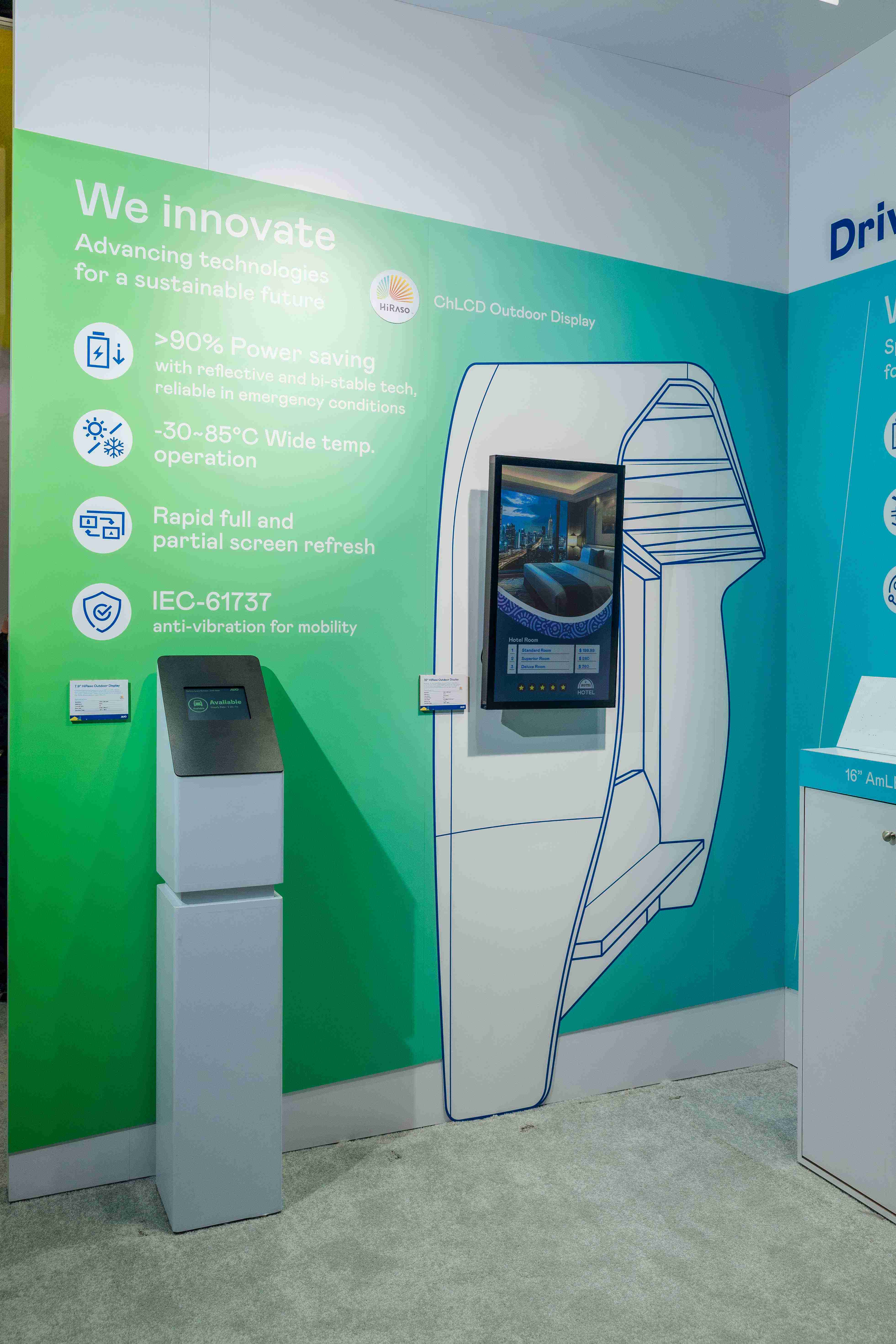 HiRaso胆固醇液晶显示器运用反射环境光线的方式,,,,呈现影像显示时零耗能的环保省电诉求,,,,光线愈强愈能呈现绝佳的色彩饱和度及显示效果,,,同时在摄氏-30度至85度间宽温的使用优势,,,,为户外电子看板的新首选。。