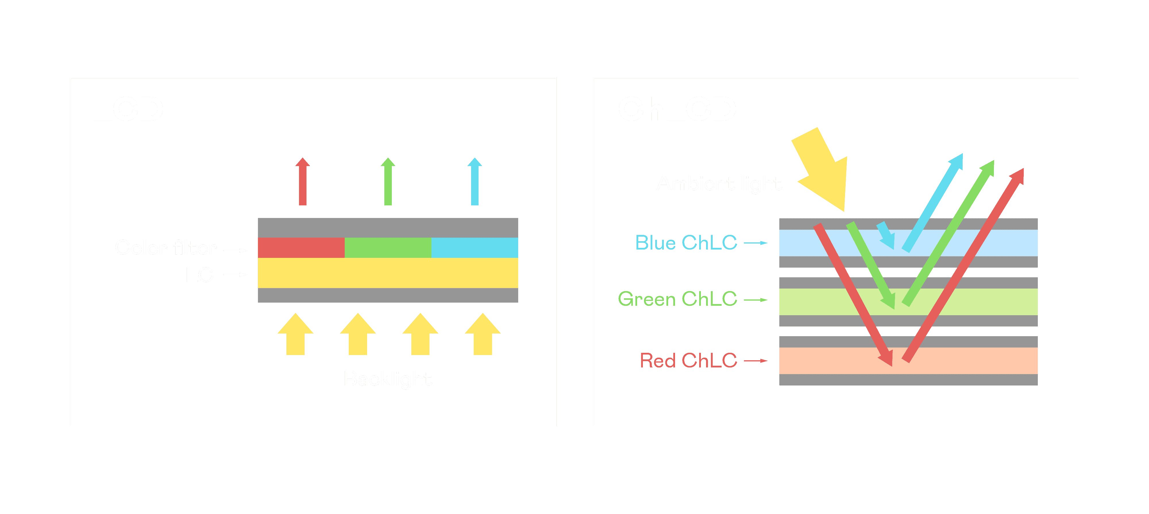 2121非凡胆固醇液晶显示器是由红、、、、绿、、蓝三层胆固醇液晶面板堆叠而成,,,,并采用无彩色滤光片设计,,,减少环境光在反射过程中的损耗。。