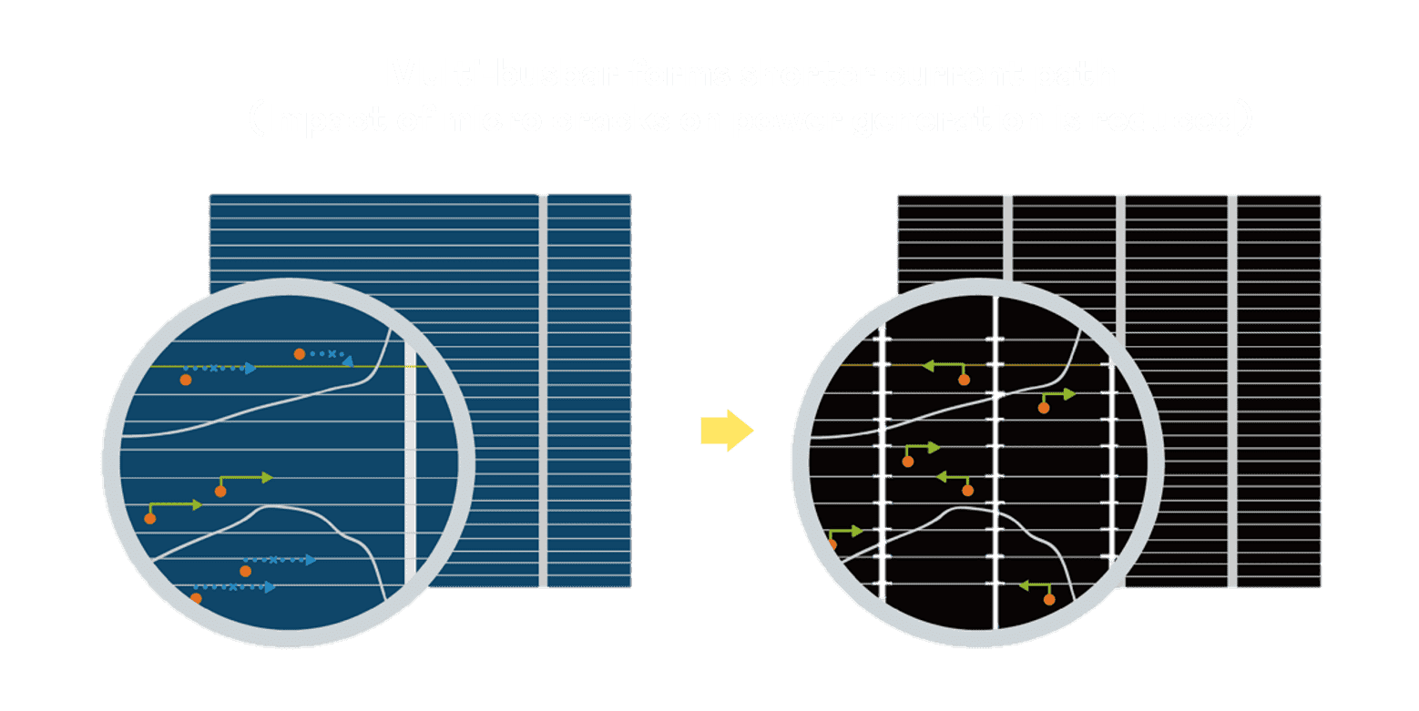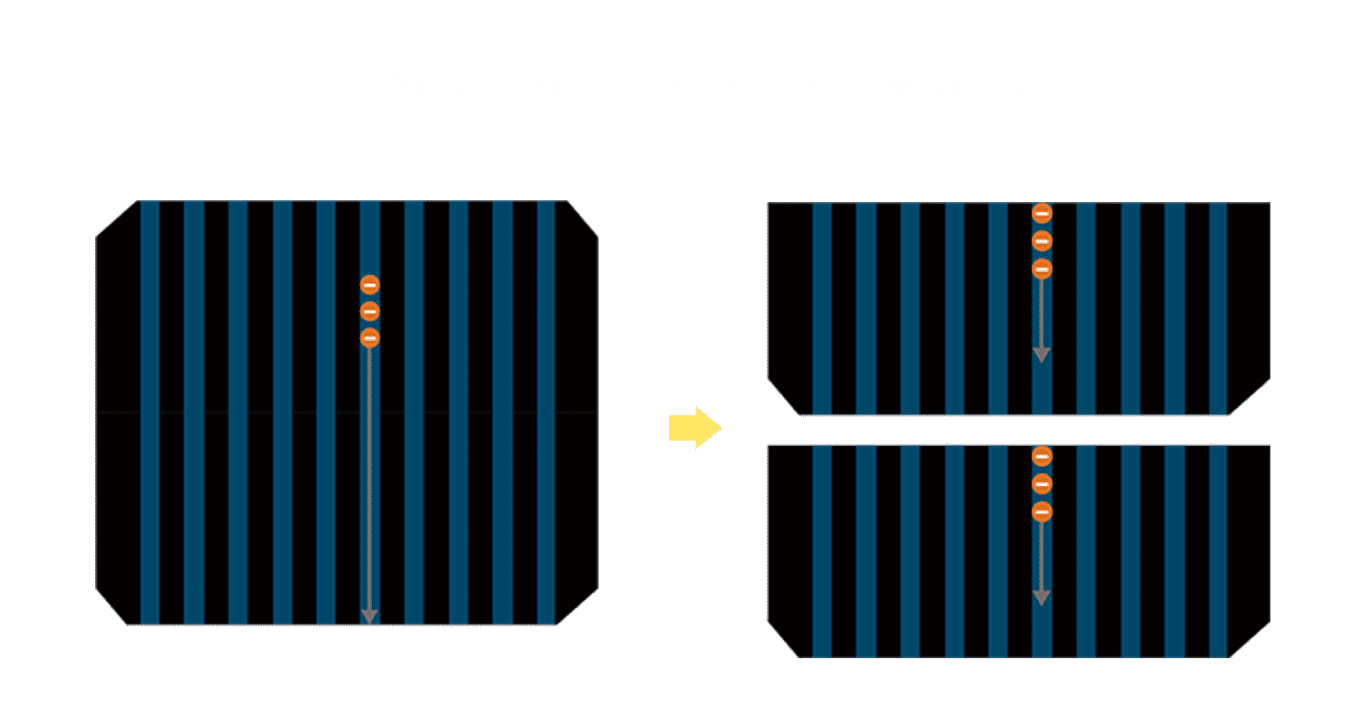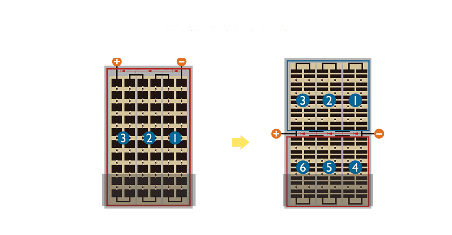 • 结合半切电池,,降低遮阴影响、、、、提升模组抗隐裂能力、、、、并减少电阻损耗,,,,进一步提升模组发电效能。。。
