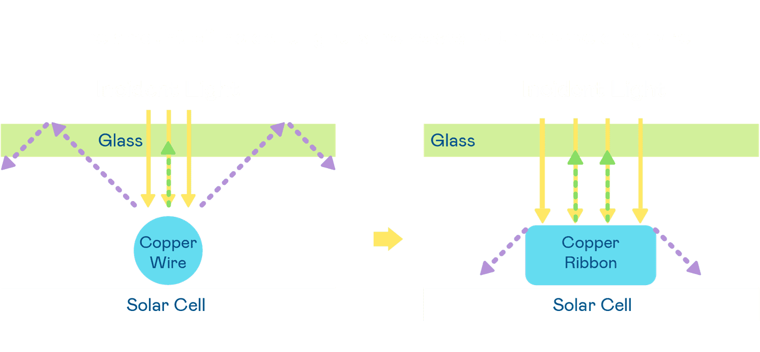 • 电池使用多条铜导线 (Copper wire) 于电池片上形成较短的电流路径,,提高电流收集效率,,采用圆形设计的铜导线较传统扁平式的铜焊带 (Ribbon),,可增加入射至电池的光线量。。。